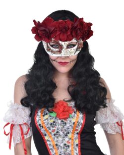 Day of the Dead styled Catrina eye mask with rich deep red flower crown.