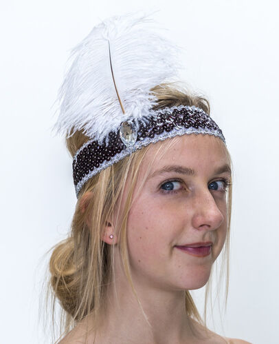 Bronze sequin headband with clear stone and large white feather .