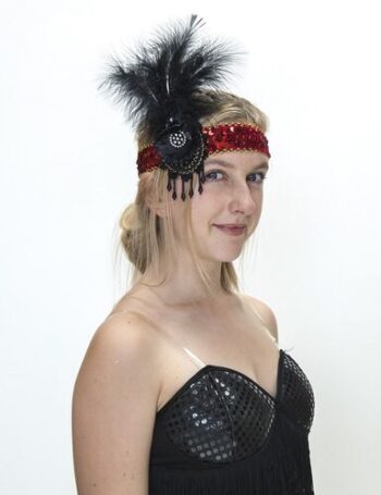 Red sequin headband with black beaded detail and black feathers .